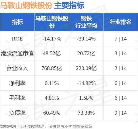马鞍山钢铁股份港股市值48.52亿港元,在钢铁行业中排名第3。主要指标见下表: