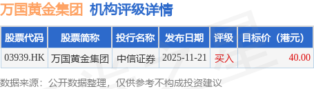 截至2026年1月29日收盘,万国黄金集团(03939.HK)报收于13.65港元,下跌4.34%,成交量1.17亿股,成交额16.22亿港元。投行对该股的评级以买入为主,近90天内共有1家投行给出买入评级,近90天的目标均价为40港元。中信证券最新一份研报给予万国黄金集团买入评级,目标价40港元。