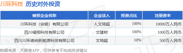 证券之星消息,根据天眼查APP显示,川环科技(300547.SZ)新增一起对外投资事件,被投资公司为川环科技(安徽)有限公司,法定代表人人文琦超,投资占比为100%。该公司从事科技推广和应用服务业,注册资本为10000万人民币。目前,川环科技共存在对外投资3项,详见下表: