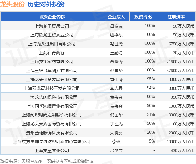 证券之星消息,根据天眼查APP显示,龙头股份(600630.SH)新增一起对外投资事件,被投资公司为贵州叁枪服饰科技有限公司,法定代表人朱晓丽,投资占比为20%。该公司从事,注册资本为2000万人民币。目前,龙头股份共存在对外投资15项,详见下表: