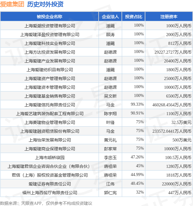 证券之星消息,根据天眼查APP显示,爱建集团(600643.SH)新增一起对外投资事件,被投资公司为上海爱潮投资管理有限公司,法定代表人潘颺,投资占比为100%。该公司从事商务服务业,注册资本为1000万人民币。目前,爱建集团共存在对外投资28项,投资占比前20的项目见下表: