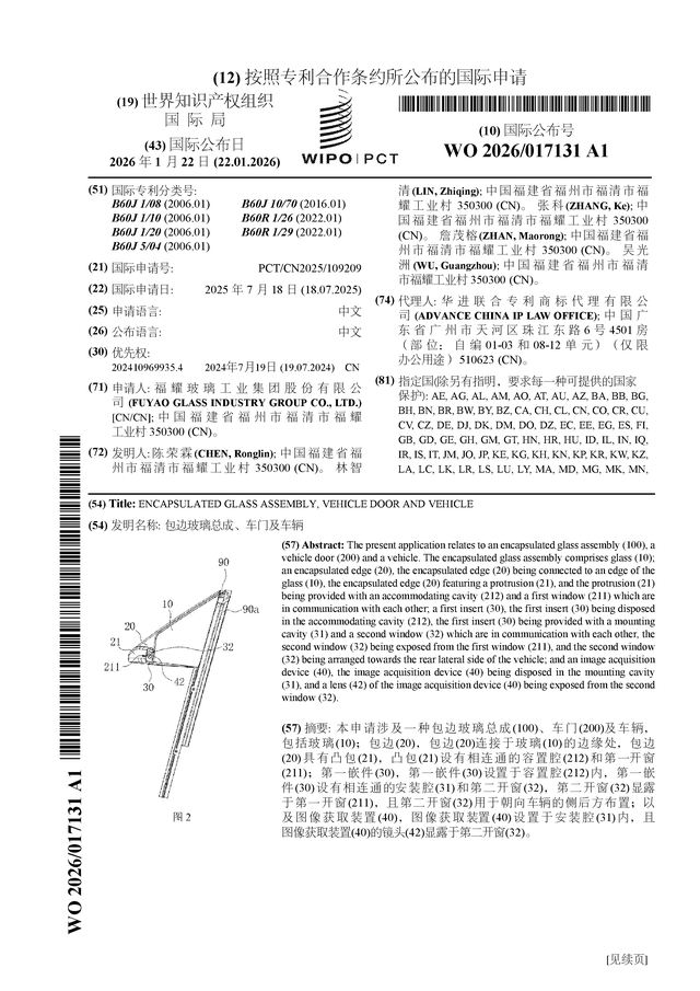 证券之星消息,根据企查查数据显示福耀玻璃(600660)公布了一项国际专利申请,专利名为“包边玻璃总成、车门及车辆”,专利申请号为PCT/CN2025/109209,国际公布日为2026年1月22日。