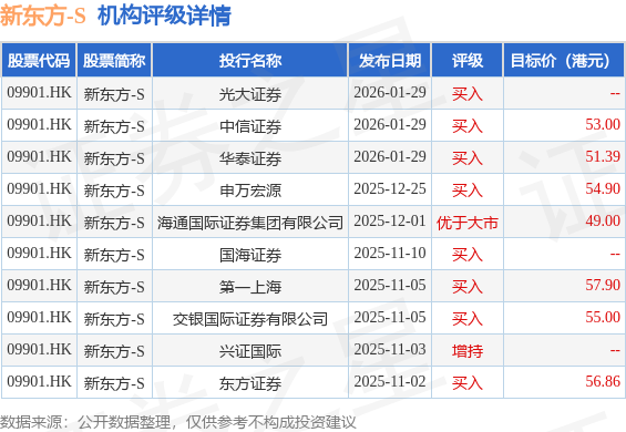 投行对该股的评级以买入为主,近90天内共有8家投行给出买入评级,近90天的目标均价为54.01港元。光大证券最新一份研报给予新东方-S买入评级。