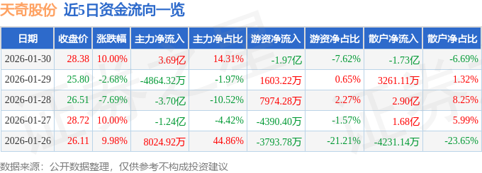 1月30日的资金流向数据方面,主力资金净流入3.69亿元,占总成交额14.31%,游资资金净流出1.97亿元,占总成交额7.62%,散户资金净流出1.73亿元,占总成交额6.69%。