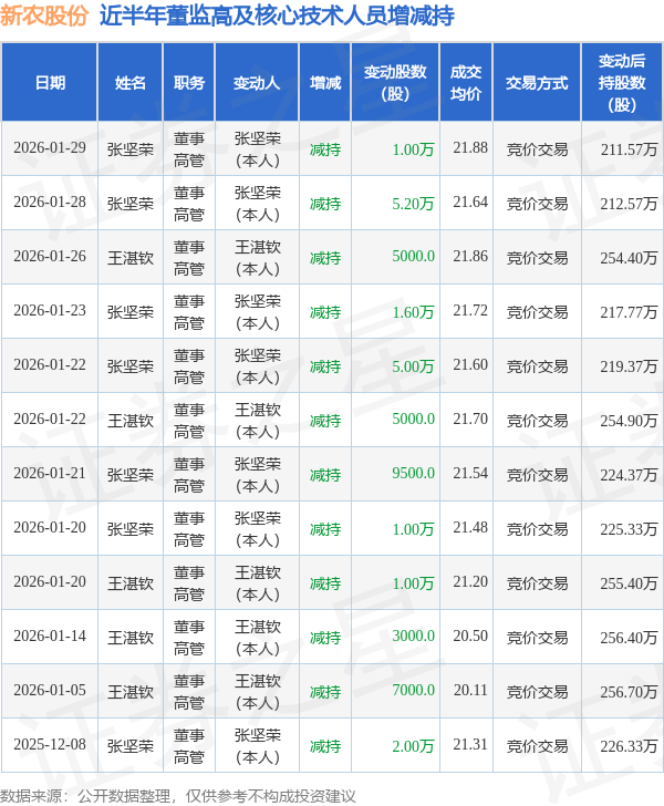 新农股份近半年内的董监高及核心技术人员增减持详情如下:
