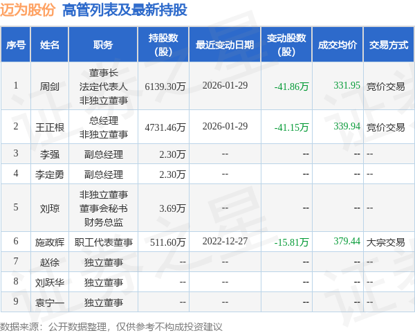 证券之星消息,根据1月30日市场公开信息、上市公司公告及交易所披露数据整理,迈为股份(300751)最新董监高及相关人员股份变动情况:2026年1月29日公司董事周剑、董事,高管王正根共减持公司股份83.01万股,占公司总股本为0.2971%。变动期间公司股价下跌4.82%,1月29日当日收盘报325.73元。