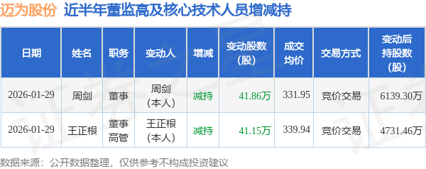 迈为股份近半年内的董监高及核心技术人员增减持详情如下: