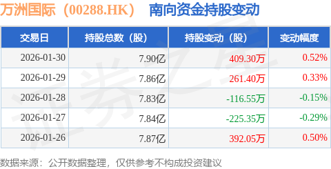 证券之星消息,1月30日南向资金增持409.3万股万洲国际(00288.HK)。近5个交易日中,获南向资金增持的有3天,累计净增持720.85万股。近20个交易日中,获南向资金增持的有12天,累计净增持412.39万股。截至目前,南向资金持有万洲国际(00288.HK)7.9亿股,占公司已发行普通股的6.14%。