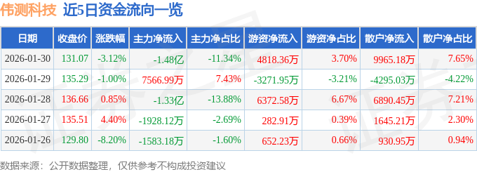证券之星消息,截至2026年1月30日收盘,伟测科技(688372)报收于131.07元,下跌3.12%,换手率6.77%,成交量10.08万手,成交额13.03亿元。