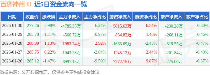 证券之星消息,截至2026年1月30日收盘,百济神州(688235)报收于277.26元,下跌2.98%,换手率2.36%,成交量2.72万手,成交额7.67亿元。