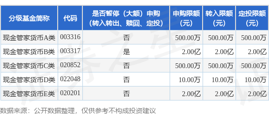 证券之星消息,1月31日中银国际证券股份有限公司发布《中银证券现金管家货币市场基金调整大额申购(含转换转入和定期定额投资)限额的公告》。公告中提示,为满足广大投资者的需求,更好地运作基金资产,自2026年2月2日起中银证券现金管家货币市场基金调整大额申购(含转换转入和定期定额投资)限额,下属分级基金调整明细如下: