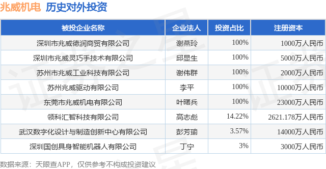 证券之星消息,根据天眼查APP显示,兆威机电(003021.SZ)新增一起对外投资事件,被投资公司为深圳市兆威德润商贸有限公司,法定代表人谢燕玲,投资占比为100%。该公司从事批发业,注册资本为1000万人民币。目前,兆威机电共存在对外投资8项,详见下表: