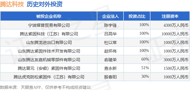 通过天眼查大数据分析,山东腾达紧固科技股份有限公司共对外投资了6家企业,参与招投标项目34次;财产线索方面有商标信息31条,专利信息50条,著作权信息3条;此外企业还拥有行政许可30个。据2024年报数据,腾达科技商誉0.0万元。