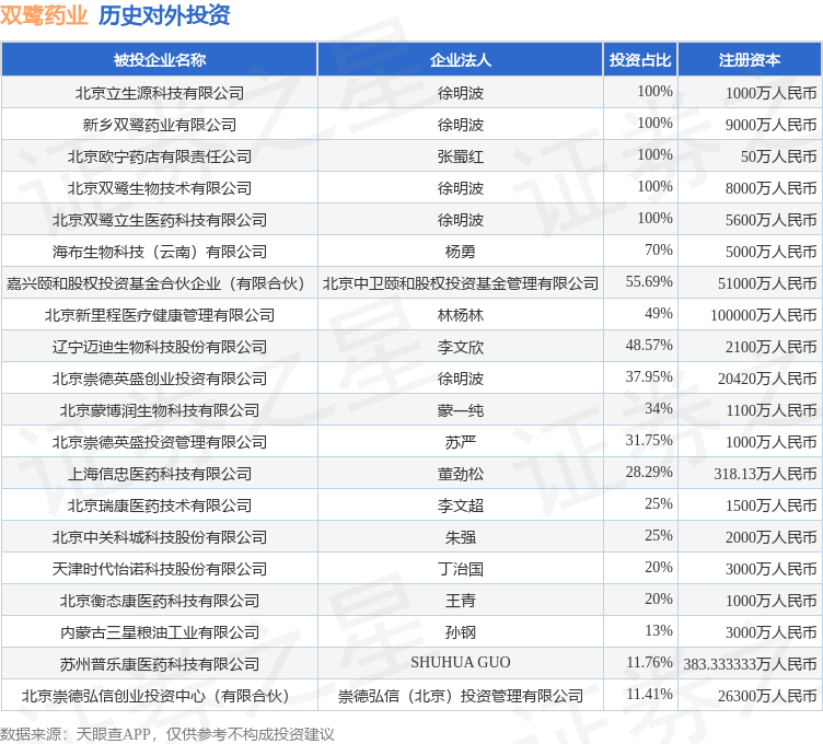 证券之星消息,根据天眼查APP显示,双鹭药业(002038.SZ)新增一起对外投资事件,被投资公司为北京衡态康医药科技有限公司,法定代表人王青,投资占比为20%。该公司从事科技推广和应用服务业,注册资本为1000万人民币。目前,双鹭药业共存在对外投资26项,投资占比前20的项目见下表: