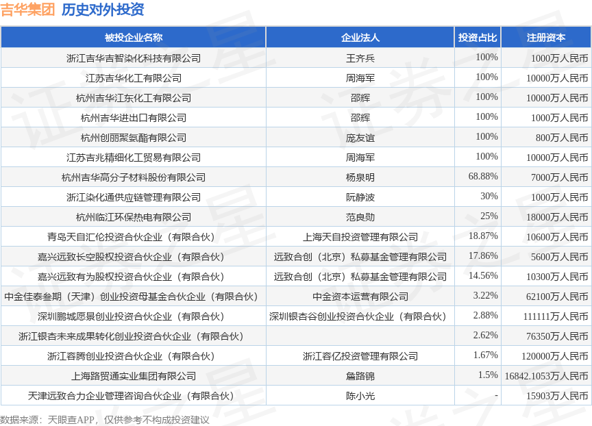 证券之星消息,根据天眼查APP显示,吉华集团(603980.SH)新增一起对外投资事件,被投资公司为浙江银杏未来成果转化创业投资合伙企业(有限合伙),法定代表人,投资占比为2.62%。该公司从事商务服务业,注册资本为76350万人民币。目前,吉华集团共存在对外投资18项,详见下表: