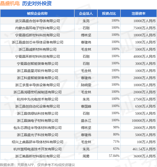 证券之星消息,根据天眼查APP显示,晶盛机电(300316.SZ)新增一起对外投资事件,被投资公司为武汉晶盛合创半导体有限公司,法定代表人朱亮,投资占比为100%。该公司从事计算机、通信和其他电子设备制造业,注册资本为10000万人民币。目前,晶盛机电共存在对外投资36项,投资占比前20的项目见下表: