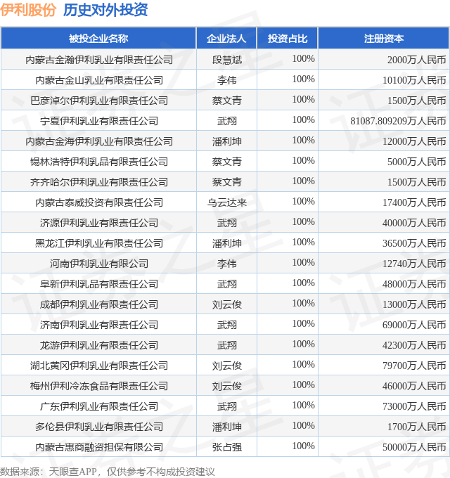 通过天眼查大数据分析,内蒙古伊利实业集团股份有限公司共对外投资了123家企业,参与招投标项目1435次;财产线索方面有商标信息18730条,专利信息5893条,著作权信息648条;此外企业还拥有行政许可119个。据2024年报数据,伊利股份商誉23.37亿元,同比减54.72%。长期股权投资39.92亿元,同比减9.44%。