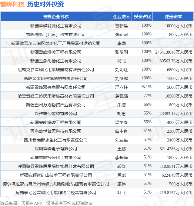 证券之星消息,根据天眼查APP显示,雪峰科技(603227.SH)新增一起对外投资事件,被投资公司为新疆雪峰国际供应链有限责任公司,法定代表人冯立柱,投资占比为42.5%。该公司从事装卸搬运和仓储业,注册资本为2000万人民币。目前,雪峰科技共存在对外投资26项,投资占比前20的项目见下表: