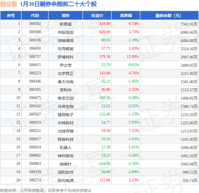 创业板融券余额前三分别为:新易盛(300502)融券余额7341.91万元、中际旭创(300308)融券余额6906.66万元、信维通信(300136)融券余额4484.88万元,前20具体见下表: