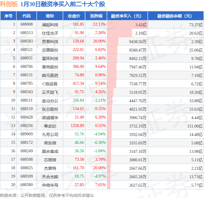 科创板融资净买入前三分别为:澜起科技(688008)融资净买入3.42亿元、仕佳光子(688313)融资净买入2.1亿元、思看科技(688583)融资净买入9438.5万元,前20具体见下表: