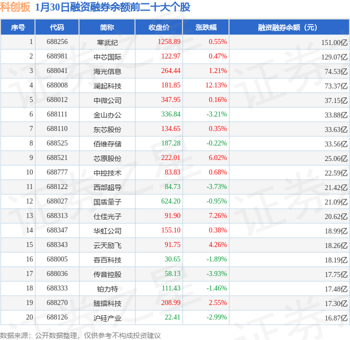 科创板融资融券余额前三分别为:寒武纪(688256)融资融券余额151亿元、中芯国际(688981)融资融券余额129.07亿元、海光信息(688041)融资融券余额74.53亿元,前20具体见下表: