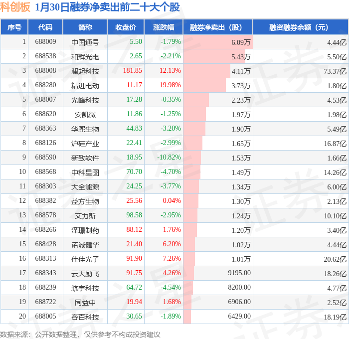 科创板融券净卖出前三分别为:中国通号(688009)融券净卖出6.09万股、和辉光电(688538)融券净卖出5.43万股、澜起科技(688008)融券净卖出4.11万股,前20具体见下表: