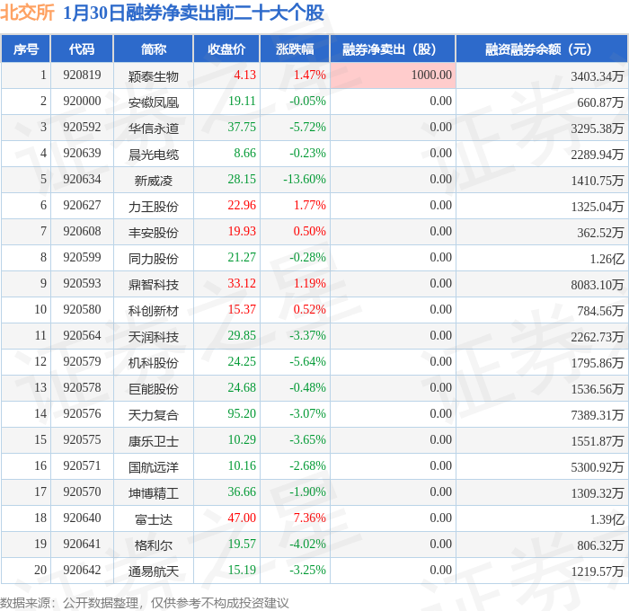 北交所融券净卖出前三分别为:颖泰生物(920819)融券净卖出1000股,前20具体见下表: