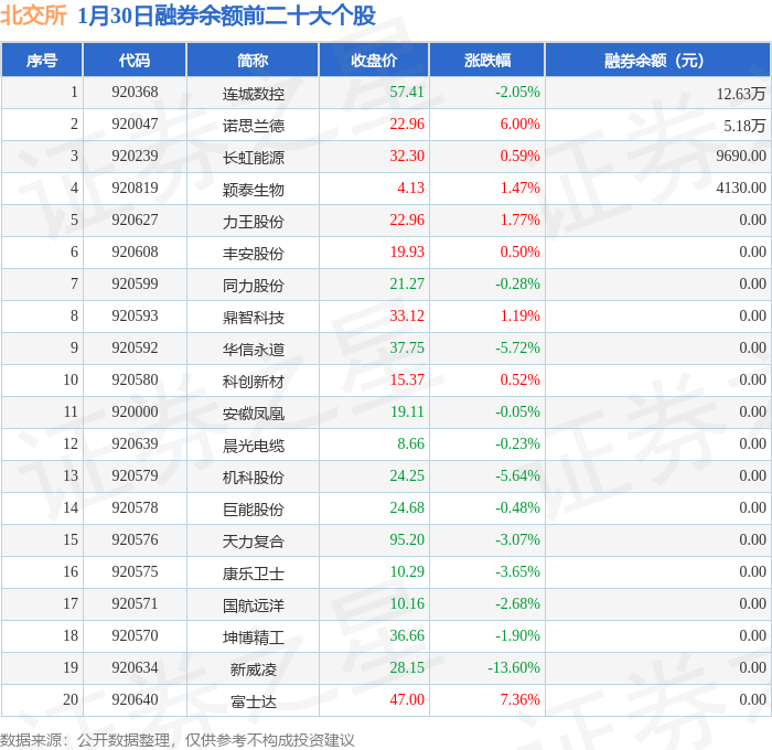 北交所融券余额前三分别为:连城数控(920368)融券余额12.63万元、诺思兰德(920047)融券余额5.18万元、长虹能源(920239)融券余额9690元,前20具体见下表: