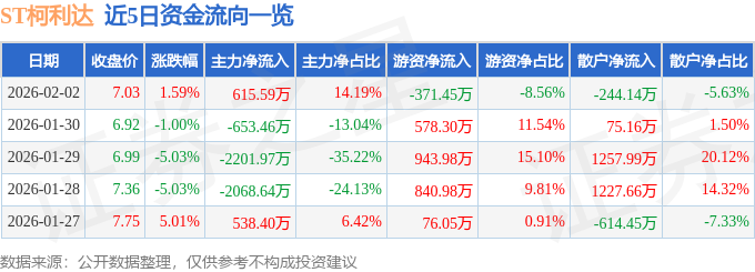 证券之星消息,截至2026年2月2日收盘,ST柯利达(603828)报收于7.03元,上涨1.59%,换手率1.05%,成交量6.26万手,成交额4339.08万元。