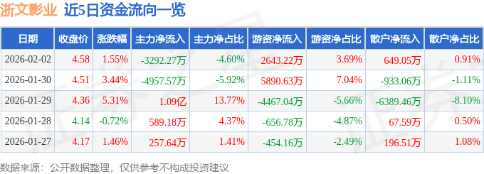 证券之星消息,截至2026年2月2日收盘,浙文影业(601599)报收于4.58元,上涨1.55%,换手率13.17%,成交量152.88万手,成交额7.16亿元。
