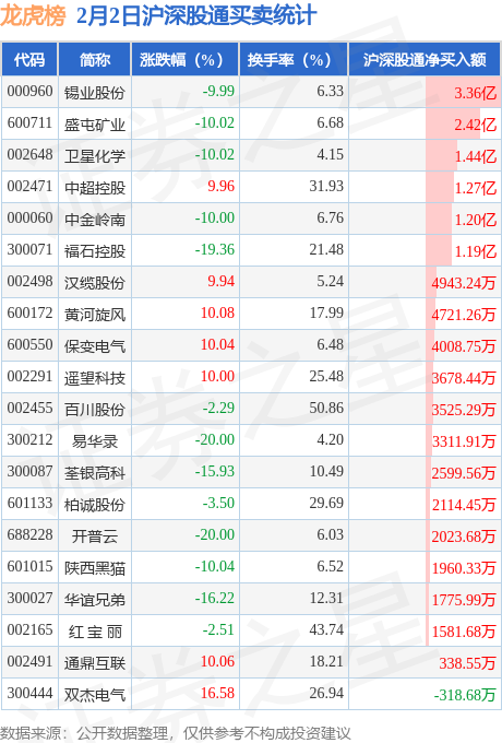 龙虎榜中有沪股通/深股通专用席位(北向资金)现身的个股共29家,其中锡业股份以净买入3.36亿元排名第一。详情见下表: