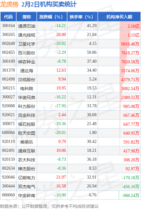 当日公布的交易所龙虎榜中有机构专用席位现身的个股共34家,其中通源石油以净买入2.16亿元排名第一。详情见下表: