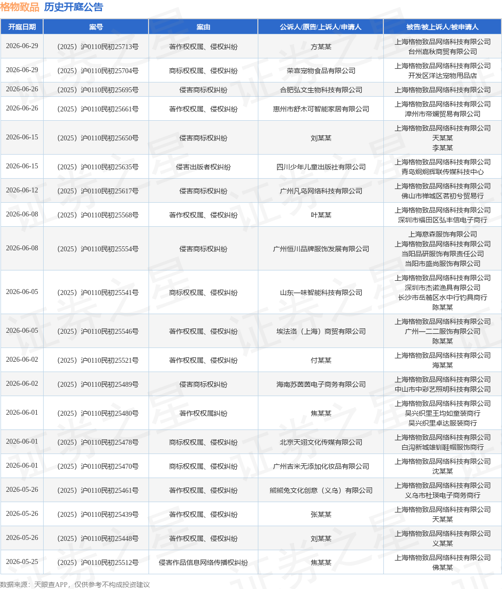 案号:(2025)沪0110民初27054号根据统计,近一年内以上海格物致品网络科技有限公司为当事人的历史开庭公告有3950则,其中案由为“侵害外观设计专利权纠纷”的公告以881则居首,其次为“侵害商标权纠纷”有802则,“著作权权属、侵权纠纷”有655则。历史开庭公告(前20条)如下: