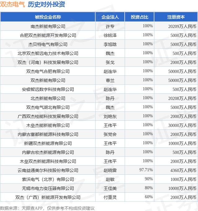 证券之星消息,根据天眼查APP显示,双杰电气(300444.SZ)新增一起对外投资事件,被投资公司为宁夏电投永利能源有限公司,法定代表人于海洋,投资占比为14.08%。该公司从事电力、热力生产和供应业,注册资本为213000万人民币。目前,双杰电气共存在对外投资28项,投资占比前20的项目见下表:
