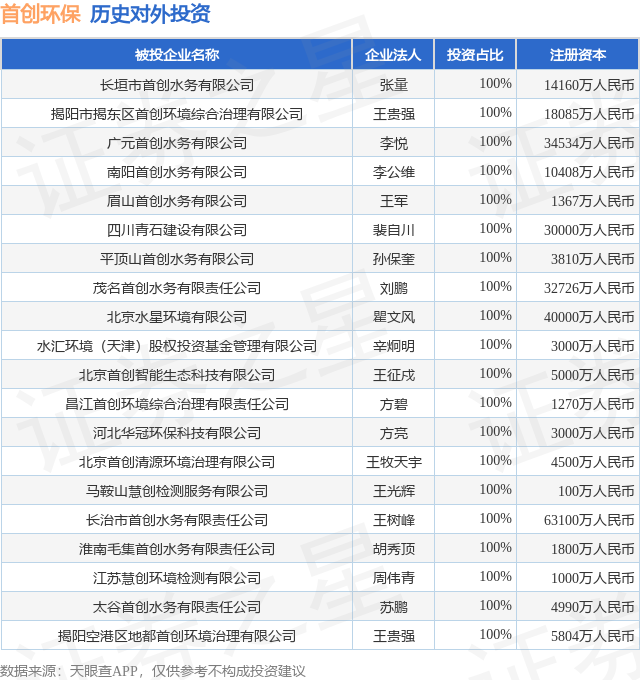 证券之星消息,根据天眼查APP显示,首创环保(600008.SH)新增一起对外投资事件,被投资公司为长垣市首创水务有限公司,法定代表人张量,投资占比为100%。该公司从事水的生产和供应业,注册资本为14160万人民币。目前,首创环保共存在对外投资220项,投资占比前20的项目见下表: