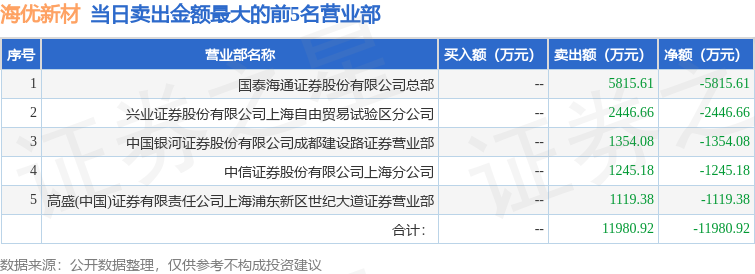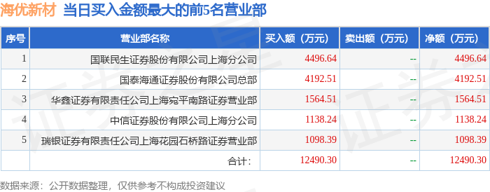 证券之星消息,沪深交易所2026年2月3日公布的交易公开信息显示,海优新材(688680)因有价格涨跌幅限制的日收盘价格涨幅达到15%的前五只证券登上龙虎榜。此次是近5个交易日内第1次上榜。