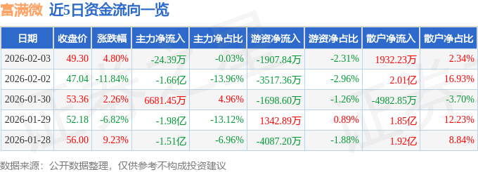 证券之星消息,截至2026年2月3日收盘,富满微(300671)报收于49.3元,上涨4.8%,换手率7.7%,成交量17.0万手,成交额8.25亿元。