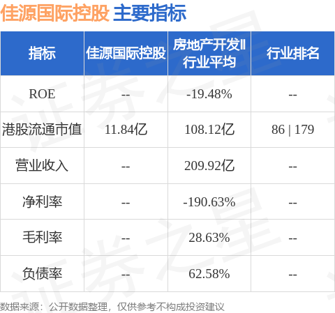 佳源国际控股港股市值11.84亿港元,在房地产开发Ⅱ行业中排名第86。主要指标见下表:
