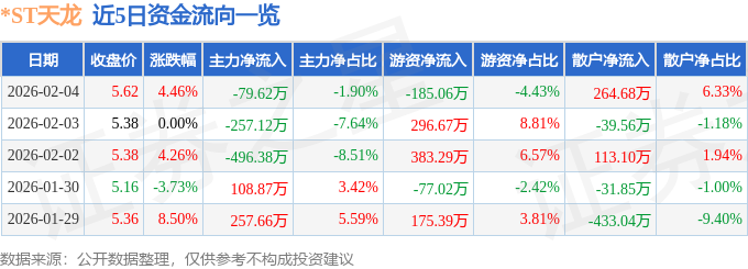 证券之星消息,截至2026年2月4日收盘,*ST天龙(300029)报收于5.62元,上涨4.46%,换手率3.75%,成交量7.5万手,成交额4181.97万元。
