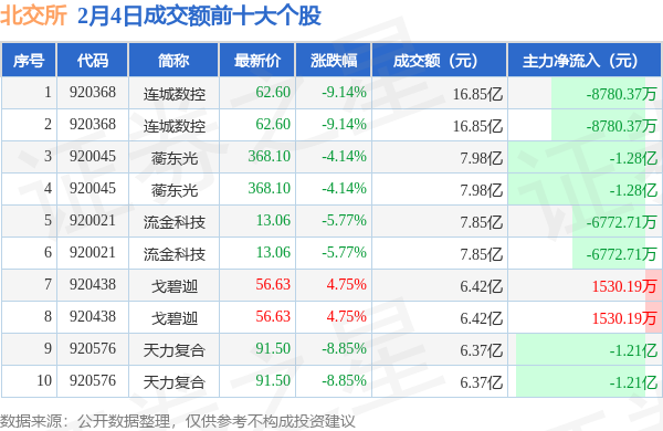 当日北交所成交额前10大个股中2只个股收涨,平均涨幅4.75%,其中连城数控(920368)以成交额16.85亿元排第一。从主力资金流入看,成交额前10大个股中有2只个股呈现主力资金净流入。
