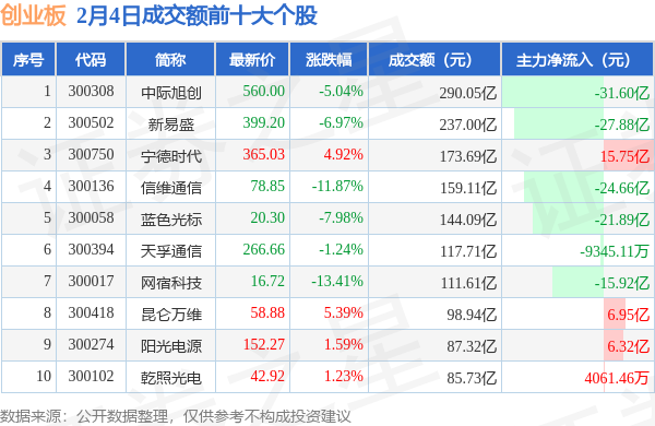 当日创业板成交额前10大个股中4只个股收涨,平均涨幅3.28%,其中中际旭创(300308)以成交额290.05亿元排第一。从主力资金流入看,成交额前10大个股中有4只个股呈现主力资金净流入。