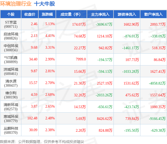 个股表现方面,环境治理行业当日领涨股为ST京蓝(000711),该股当日报收2.46,上涨5.13%,成交量174.07万,主力资金净流出3696.67万元。启迪环境(000826)以上涨4.41%紧随其后,该股当日成交量74.68万,主力资金净流入1214.1万元。除此之外,中创环保(300056)、*ST凯鑫(300899)、洪城环境(600461)均进入当日牛股之列。具体个股列表见下表:
