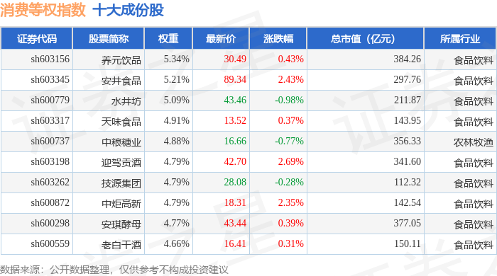 消费等权(000074)指数十大成份股详情如下: