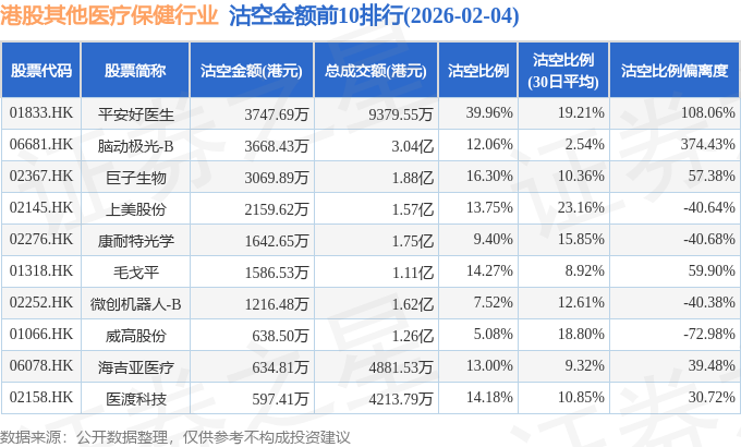 从沽空比例来看,平安好医生、爱康医疗、微创心通-B沽空比例位居行业前三,分别为39.96%、29.19%、28.11%。