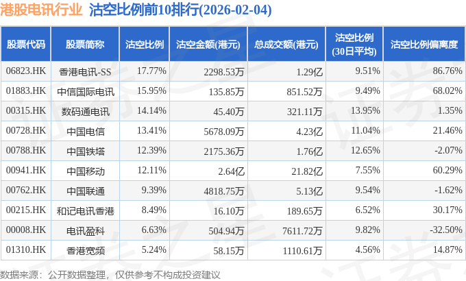 从沽空比例来看,香港电讯-SS、中信国际电讯、数码通电讯沽空比例位居行业前三,分别为17.77%、15.95%、14.14%。