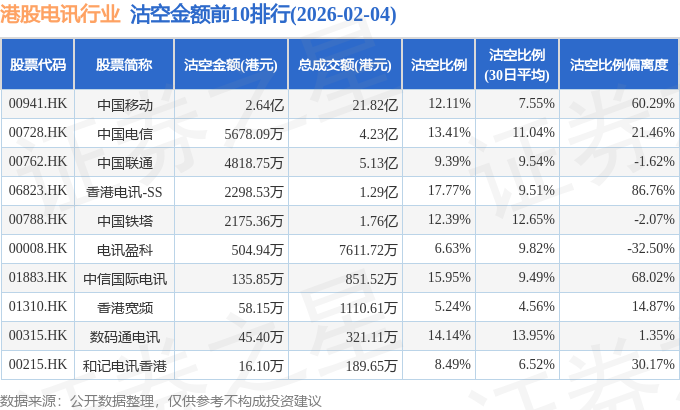 从沽空比例偏离度来看,香港电讯-SS、中信国际电讯、中国移动沽空比例偏离度位居行业前三,分别为86.76%、68.02%、60.29%。