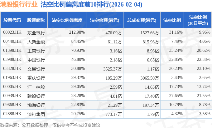 从沽空比例偏离度来看,东亚银行、大新金融、工商银行沽空比例偏离度位居行业前三,分别为212.98%、84.45%、70.93%。