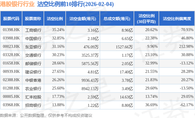 从沽空比例来看,工商银行、中国银行、东亚银行沽空比例位居行业前三,分别为35.24%、32.85%、31.16%。