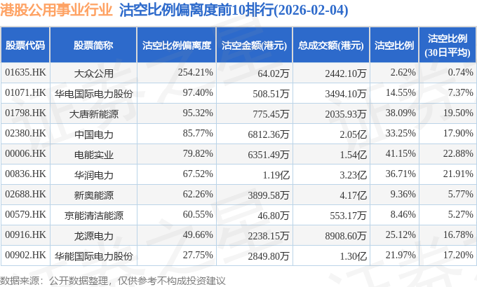 从沽空比例偏离度来看,大众公用、华电国际电力股份、大唐新能源沽空比例偏离度位居行业前三,分别为254.21%、97.4%、95.32%。