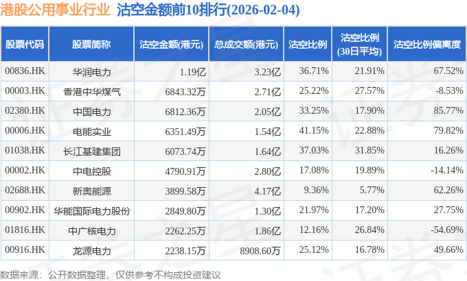从沽空金额来看,华润电力、香港中华煤气、中国电力沽空金额位居行业前三,分别为1.19亿港元、6843.32万港元、6812.36万港元。